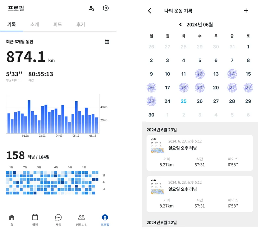 3. 추가된 기록은 프로필 화면의 러닝 통계와 러닝 캘린더를 통해 확인할 수 있어요.