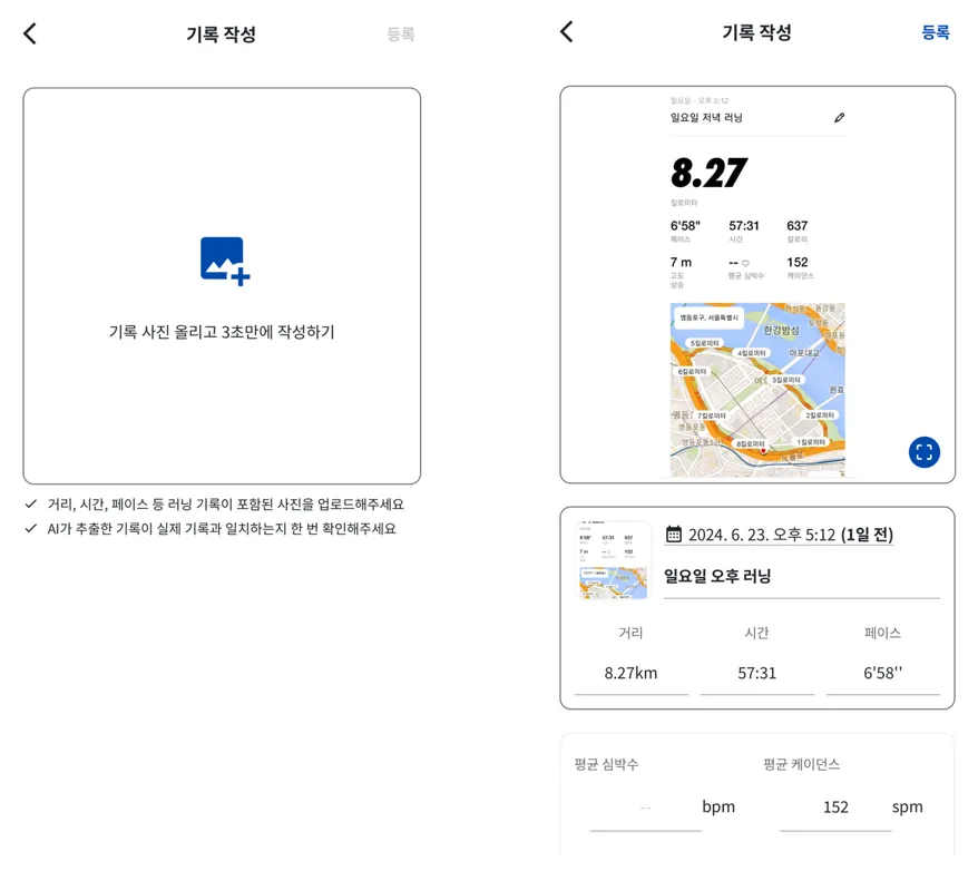 2. 러닝 기록이 포함된 이미지(가민, 삼성 갤럭시, 애플 워치, NRC 등)를 업로드하고 간편하게 기록을 작성해보세요.